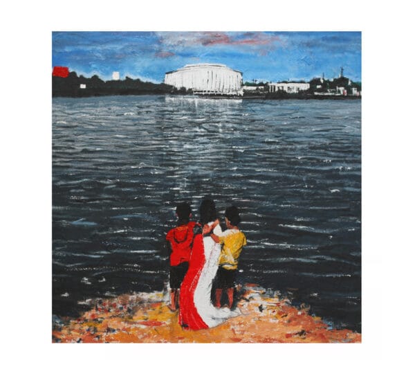 Lukisan ini menampilkan tiga sosok—dua anak kecil dan seorang wanita dewasa—berdiri di pinggir pantai, memandang ke arah laut yang mengarah ke sebuah bangunan besar di kejauhan, mungkin sebuah stadion atau gedung pemerintahan. Pakaian mereka mencolok dengan warna-warna merah, putih, dan kuning, yang mungkin memiliki simbolisme kuat, seperti warna bendera atau harapan akan masa depan yang lebih baik. Sapuan kuas menggambarkan air yang beriak dengan lembut, memberikan kesan ketenangan namun tetap penuh energi.